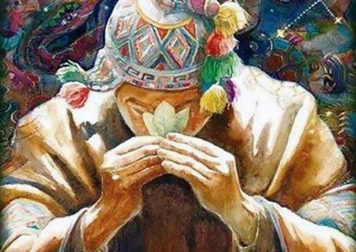 * El sol de agosto ilumina el rostro de los invitados, mientras mascan la hoja sagrada sin tragarla y toman chicha u otra bebida con…